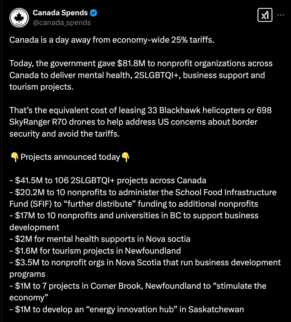I would suggest that anyone claiming this tweet does not "weigh in on whether spending is good or bad" can't even be understood misunderstand persuasion in good faith. They're lying, brazenly, and trusting that they'll get away with it. The "easy to understand" transformation of comparing these expenditures to how many Blackhawks could be leased (no specificity on lease duration, weird) is presented without the context that this money represents a small fraction of the money the country already committed to border security in response to the initial tariff threats, never mind the more salient context that the US insisted that border security would not prevent the tariffs. You will be shocked to learn that, while his name no longer appears anywhere on either the Canada Spends or Build Canada team pages, this Disneyland fairy tale that the tariffs are in response to a bonafide American concern about Canadian border security that can be addressed via helicopters has been central to Tobi Lutke's Trump apologia for the past month.